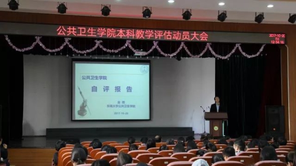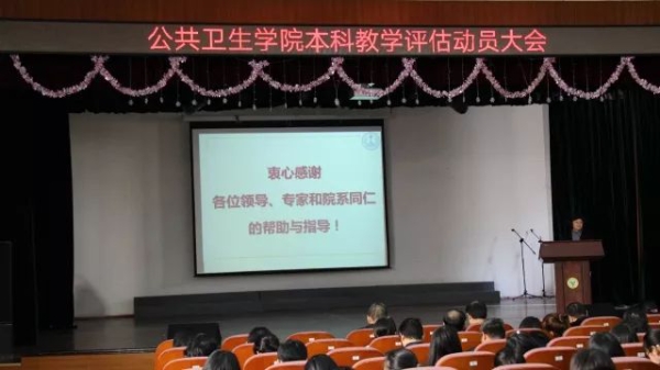 金辉副院长代表学院向全体师生汇报了自评报告内容。报告分为学院介绍、人才培养、亮点与特色、问题与思考四个部分。通过多年的教学改革探索,学院提出了“以公共卫生实践为主体、核心胜任力为导向、实践创新为核心”的教育教学理念,形成了“一体两翼三保障四促进”的教育教学培养模式。通过对我院所面临的困境与思考,他提出了学院的未来发展方向,并鼓励同学们以公共卫生为己任。