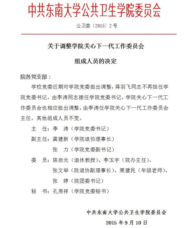 公卫委〔2015〕2号 关于调整学院关心下一代工作委员会组成人员的决定