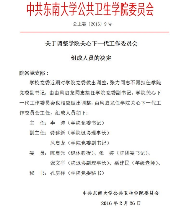 公卫委〔2016〕9号 关于调整学院关心下一代工作委员会组成人员的决定