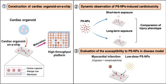先前的研究已初步证明MNPs具有潜在的心脏毒性,但对其损伤效应及潜在机制仍缺乏更全面认知,主要受限于以下的原因:(1)当前研究严重依赖传统的毒理学平台,其种属差异以及体外2D模型缺失细胞通讯等不足影响了研究结论的可靠性。(2)目前的研究大多采取MNPs的单一时间点暴露,忽略了对不同暴露时间窗口下损伤事件的捕捉。(3)现有研究几乎都是基于健康模型评估MNPs的心脏损伤风险,在心脏病理条件下对于MNPs的易感性知之甚少。为解决上述限制,梁戈玉教授/陈早早研究员团队构建了包含有多种关键心脏细胞类型的人诱导多能干细胞(iPSC)衍生的心脏类器官(CO),并整合器官芯片技术(OoC),高仿真性地模拟了暴露场景,对短期和长期暴露于PS-NPs引起的心脏损伤进行了动态观察。其结果证实氧化应激、炎症应答、钙离子稳态失衡和线粒体功能障碍是触发心脏损伤的早期关键事件,心脏纤维化是长期暴露后的晚期结局。值得注意的是,尽管低剂量PS-NPs在健康模型中没有表现出明显的心脏毒性,但病理状态下加剧了心肌梗死症状。上述发现进一步加深了对于PS-NPs诱导的心脏毒性过程的理解,并提供了一个新型的体外心脏毒性评估平台,包含微流控系统和多细胞互作,为探究复杂的心脏病理生理学研究奠定基础。