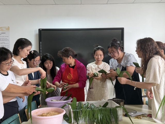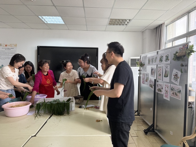 活动伊始,学院邀请包粽子手艺人“飞哥飞嫂”为师生现场演示传统粽子的包法。从浸糯米、洗粽叶、腌肉块、剪粽叶到捆扎成形,一折一叠间尽显巧思。师生们围坐在长桌前,认真学习“三角粽”“四角粽”等不同样式,现场欢声笑语不断。