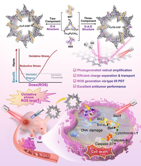 近日,bw必威西汉姆联/环境医学工程教育部重点实验室王进教授课题组在国际顶级学术期刊《Angew. Chem. Int. Ed.》上在线发表了题为《Photogenerated Radical Amplified D-A-D Metal-Covalent Organic Frameworks for Highly Efficient Photodynamic Tumor Therapy》的最新研究成果。该研究成功设计了一种三组分D-A-D型金属共价有机框架(MCOFs)(CuTD-COF)材料。与双组分D-A型材料CuT-COF相比,CuTD-COF具备更窄的带隙、更长的激发态寿命和更强的光捕获能力,从而显著增强光自由基效应。机理研究表明,D-A-D结构通过多路径电子转移促进层内电荷传输,降低激子结合能,加速载流子分离并抑制其复合,进而有效提升ROS产率。实验与理论计算共同证实,该类D-A-D型MCOFs在能带结构和氧吸附能力方面具有显著优势,展现出优异的体外光动力杀伤效果和体内抗肿瘤性能,为发展新型肿瘤光疗策略提供了新思路。