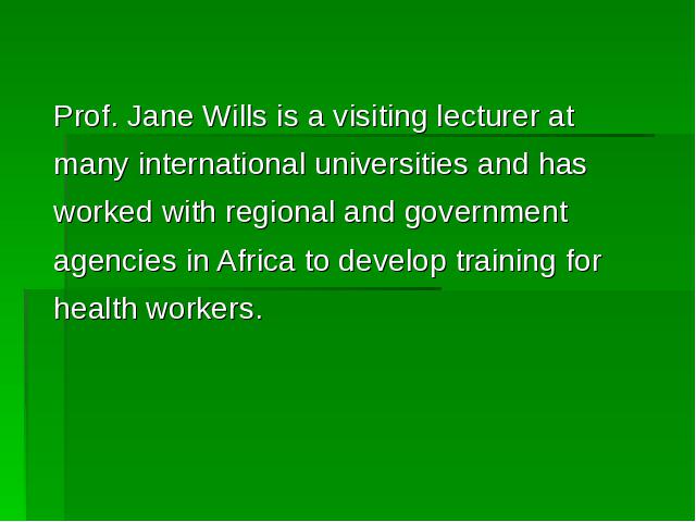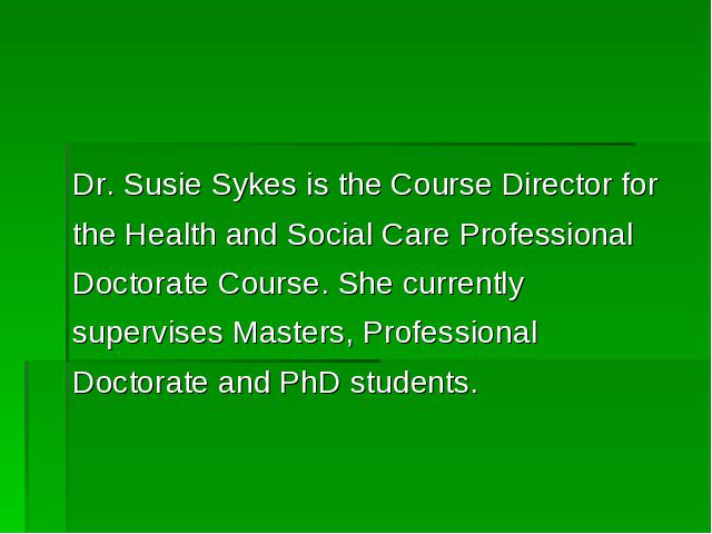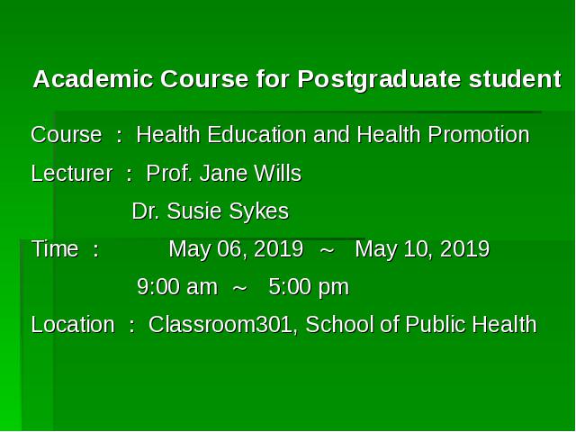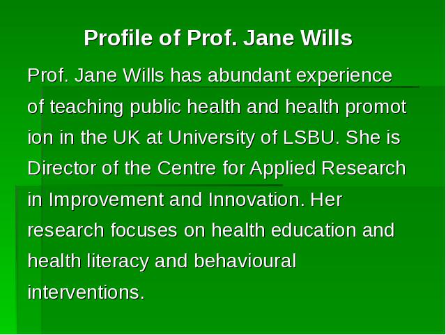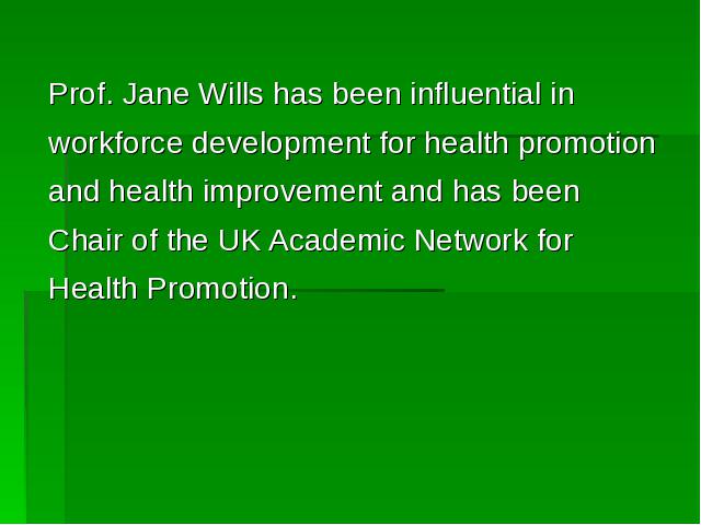 Postgraduate Course: Health Edu& Health Prom(By Prof. Jane Wills & Dr. Susie Sykes)