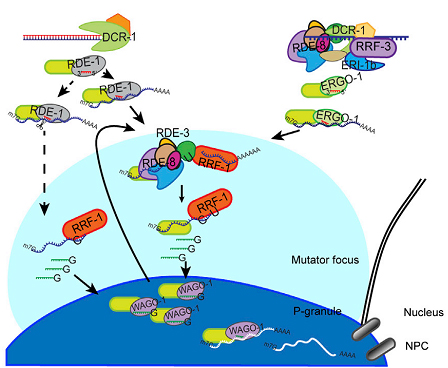 为了探索RDE-8在RNAi通路中的具体作用,研究人员将rde-8突变型和野生型细胞株暴露于靶向sel-1基因的dsRNA中,Northern blot及测序结果表明,在rde-8突变型细胞内,两种不同来源的small RNA:WAGO 22G-RNAs和ERGO-1 26G-RNA都出现了明显下降,在另一项分析中,RDE-8缺陷在造成22G-RNA减少的同时,也会引起RdRP活性明显下降;通过免疫共沉淀分析,研究人员发现RDE-8会与多种蛋白互作,定位于线虫性别因子(P-Granule),不过,免疫共沉淀并没有发现RDE-8与RdRP直接互作。