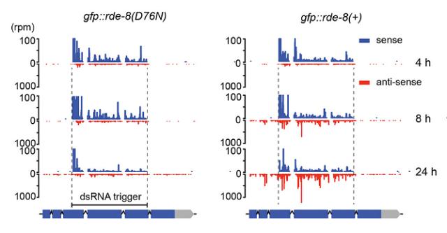 测序表明,WT型rde-8在靶向sel-1基因的primary siRNA存在时,会催化产生更多secondary siRNA,这些siRNA被比对到sel-1基因的反义链上,表明它们是以sel-1的mRNA为模板合成的