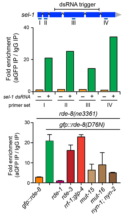 将线虫暴露于靶向sel-1的dsRNA中,对GFP::RDE-8(+)及GFP::RDE-8(D76N)突变进行RIP-qPCR实验。结果表明,GFP::RDE-8(D76N)由于缺乏核酸内切酶酶活性,在RDE-3存在时,可以较长时间结合于sel-1基因转录本上,但野生型GFP::RDE-8(WT)由于只是瞬时结合于sel-1转录本,且会很快切割转录本,所以检测不到其所结合的RNA片段