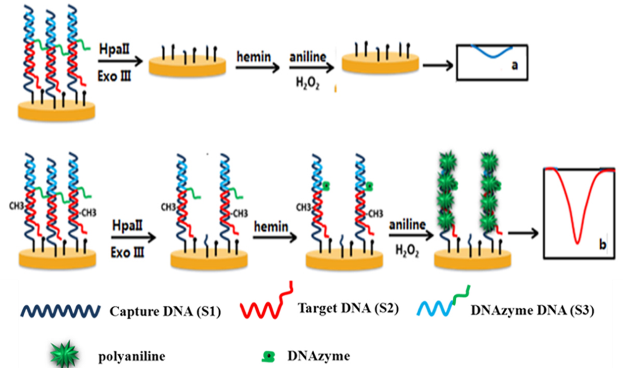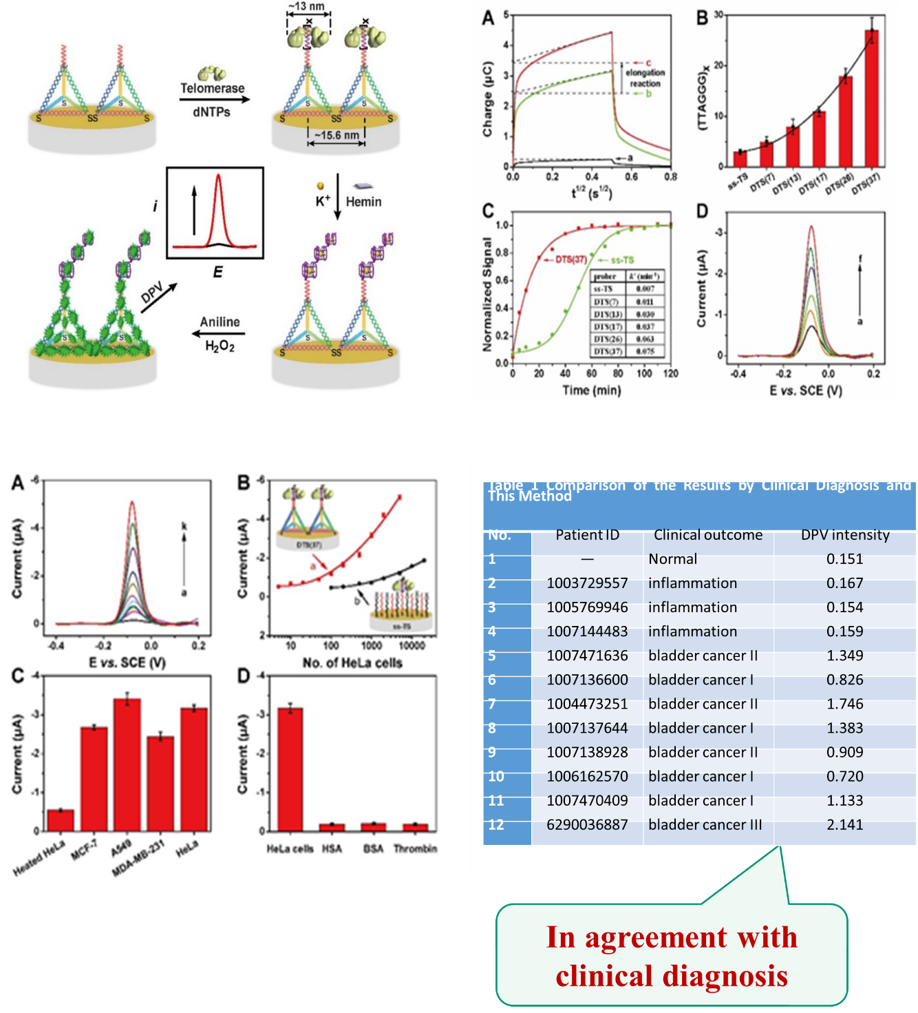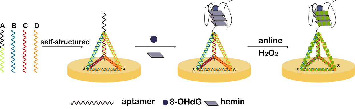 聚苯胺合成条件温合,导电性好,在分析传感中应用广泛。卫伟教授课题组通过富G的DNA序列形成G-四链体,该四链体具有类过氧化物酶的催化活性,无需标记,便可诱导苯胺聚合。此外,引入DNA正四面体纳米结构,不仅可以调节探针在电极上的固定密度,提高目标物的活性以及与探针的可接触性,而且,该四面体具有丰富的双链DNA,其表面带负电荷,易吸附带正电的苯胺,而成为苯胺聚合的优良模板。 基于上述优点,卫伟教授课题组构建了DNA甲基化酶活性、癌症患者尿液中的端粒酶及DNA氧化损伤标志性产物8-羟基脱氧鸟苷(8-OHdG)的检测新方法。
