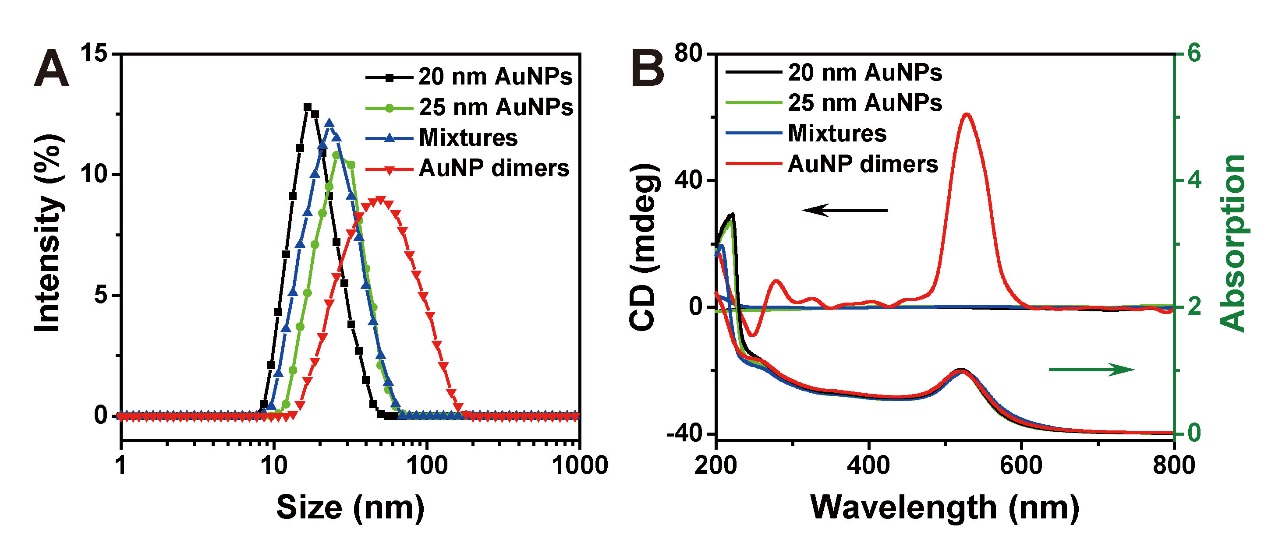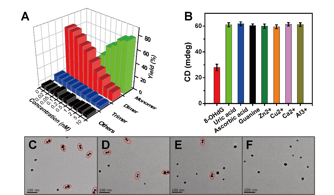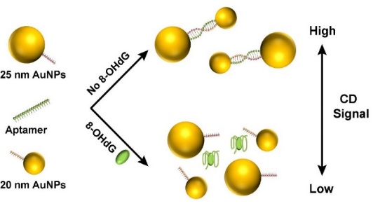卫伟教授课题组利用8-OHdG诱导的金纳米颗粒的手性组装,建立了圆二色谱检测8-OHdG的新方法。主要研究了不同尺寸金胶的组装以及不同长度的连接DNA对所组装的金胶二聚体CD信号的影响,得知20nm和25nm的金纳米颗粒由35bp的DNA连接时,其CD信号最大。我们利用DNA组装的金纳米粒子手性二聚体作为信号分子。当8-OHdG存在时,其于aptamer的亲和力大于aptamer与其互补链的亲和力,金胶二聚体结构被破坏,CD信号减弱。通过条件优化,检测的线性范围是0.05 to 2 nM,检测限可达33 pM,低于大多数关于8-OHdG的检测限。可以定量检测血液中的8-OHdG,对空白血清中做加标回收实验,准确度在92%到115%。该研究成果发表在Anal. Chem.,10.1021/acs.analchem.6b01258.